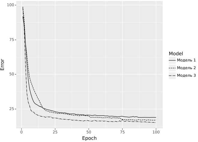 Далее каждая из ранее описанных моделей была обучена на наборе данных, содержащем результаты аналитического решения [14], основанного на теории Ми, для данных трех конфигураций цилиндров c различными значениями варьируемых параметров. Обучение каждой из сетей длилось 100 эпох. Отметим заодно длительность процесса обучения: для модели 1 она составила 62 с, для модели 2 – 45 с, для модели 3 – 57 с. При этом время подготовки обучающих данных составило 384 с. Графики изменения ошибки во время процесса обучения каждой из описанных ранее моделей приведены на рис. 8.