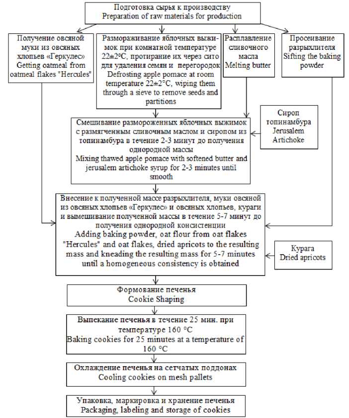 Замес теста начинается со смешивания расплавленного сливочного масла (или растительного масла для образца № 4) с выжимками и сиропом в течение 2–3 мин., до получения однородной консистенции. Благодаря данной операции питательные вещества, содержащиеся в яблочных выжимках переходят в жировой компонент, а в последующем в готовое изделие. Затем добавляют разрыхлитель, овсяные хлопья «Геркулес» и муку, полученную размолом из овсяных хлопьев «Геркулес». Хлопья придают изделию рассыпчатость и более воздушную структуру. Затем вносят измельченную курагу и полученную массу вымешивают в течение 5–7 минут до однородной консистенции. Из полученного теста делают заготовки круглой формы массой 50–60 г. и выкладывают их на противень, застеленный пергаментной бумагой.