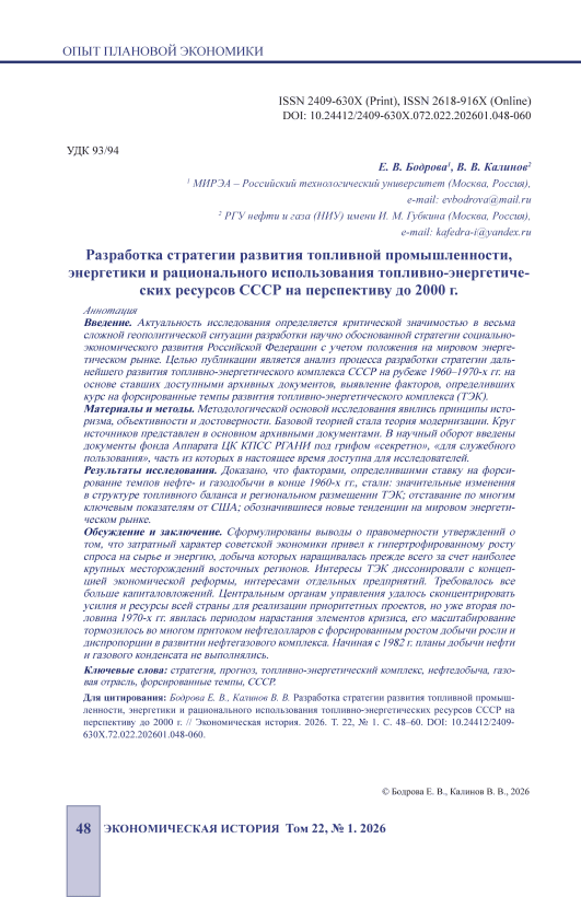 Introduction. The relevance of the study is determined by the critical importance in a very difficult geopolitical situation of the development of a scientifically substantiated strategy for the socio-economic development of the Russian Federation, taking into account the situation on the global energy market. The purpose of the publication is, based on the archival documents that have become available, to carry out an analysis of the process of developing a strategy for the further development of the fuel and energy complex of the USSR at the turn of the 1960s and 1970s, to identify the factors that determined the strategy for the accelerated development of the fuel and energy complex. Materials and Methods. The principles of historicism, objectivity and reliability were the methodological basis of the research. The basic theory was the theory of modernization. The range of sources is mainly represented by archival documents. The documents of the fund of the Central Committee of the CPSU of the Russian Academy of Sciences have been introduced into scientific circulation under the heading “Secret”, “For official use”, some of which are currently available to researchers. Results. It has been proven that the factors that determined the focus on accelerating oil and gas production in the late 1960s were significant changes in the fuel balance and regional distribution of the fuel and energy sector, a lag in many key indicators compared to the United States, and emerging new trends in the global energy market. Discussion and Conclusion. The article concludes that the cost-intensive nature of the Soviet economy led to an exaggerated increase in demand for raw materials and energy, which was primarily driven by the largest deposits in the eastern regions. The interests of the fuel and energy sector were at odds with the concept of economic reform and the interests of individual enterprises. More capital investment was required. The central government managed to concentrate the efforts and resources of the entire country on implementing priority projects, but the second half of the 1970s was a period of growing crisis elements, and its scale was largely hindered by the influx of petrodollars. With the accelerated growth of production, the development of the oil and gas complex became increasingly disproportionate. Starting in 1982, the plans for oil and gas condensate production were not being met.