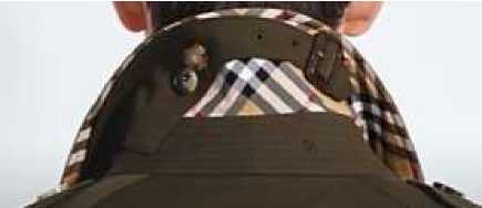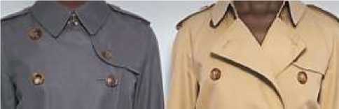 Отличительными чертами тренчкота, делающими его узнаваемым и популярным, являются: смещенная застежка, отлетная кокетка на спинке и правой детали переда, паты по низу рукава, погоны, металлические полукольца на поясе, шлица в среднем шве спинки, специальный клапан, закрывающий застежку воротника и защищающий шею от ветра (рис. 1), характерный воротник, застегивающийся на крючок (рис. 2).