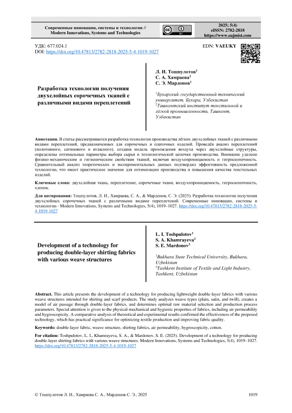 В статье рассматривается разработка технологии производства лёгких двухслойных тканей с различными видами переплетений, предназначенных для сорочечных и платочных изделий. Проведён анализ переплетений (полотняного, сатинового и атласного), создана модель прохождения воздуха через двухслойные структуры, определены оптимальные параметры выбора сырья и технологической цепочки производства. Внимание уделено физико-механическим и гигиеническим свойствам тканей, включая воздухопроницаемость и гигроскопичность. Сравнительный анализ теоретических и экспериментальных данных подтвердил эффективность предложенной технологии, что имеет практическое значение для оптимизации производства и повышения качества текстильных изделий.
