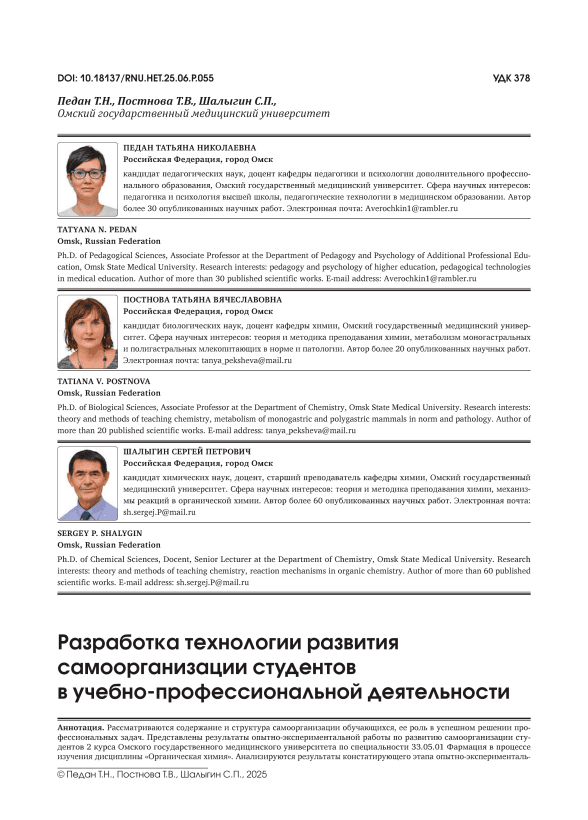 Рассматриваются содержание и структура самоорганизации обучающихся, ее роль в успешном решении профессиональных задач. Представлены результаты опытно-экспериментальной работы по развитию самоорганизации студентов 2 курса Омского государственного медицинского университета по специальности 33.05.01 Фармация в процессе изучения дисциплины «Органическая химия». Анализируются результаты констатирующего этапа опытно-эксперименталь