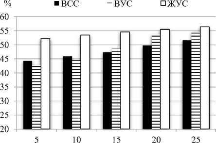 Применение крольчатины, по нашему мнению, обосновано при разработке продукта, превосходящего аналоги по пищевой ценности и отвечающего требованиям диетического рациона. Согласно данные рисунка 2 целесообразно вводить в фарш 25% мяса кролика ручной обвалки от массы мяса птицы. При таком количестве наблюдаются высокие значения функционально-технологических свойств, а именно, ВСС составляет 51,6%, ВУС – 54,5%, а ЖУС – 56,4%, что выше при внесении 5% крольчатины на 7,3, 11,7 и 4,2% соответственно.