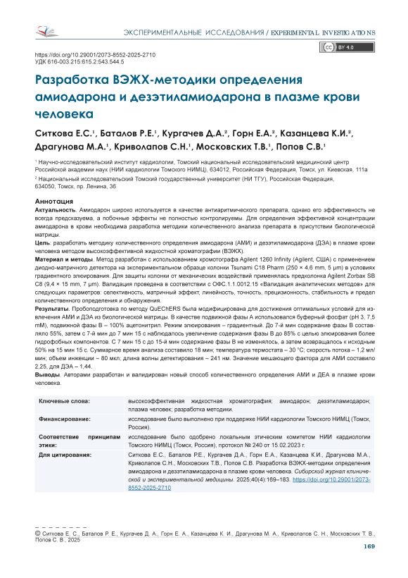 Разработка ВЭЖХ-методики определения амиодарона и дезэтиламиодарона в плазме крови человека