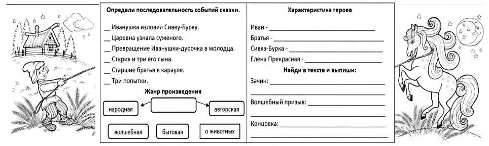 Интерактивная тетрадь содержит теоретический, графический и иллюстративный материал. Предложенные задания представлены в разных формах (найди, раскрась, соедини, допиши, подчеркни и др.). Приведём образцы ша- блонов страниц на примере темы «Русская народная сказка «Сивка-Бурка».