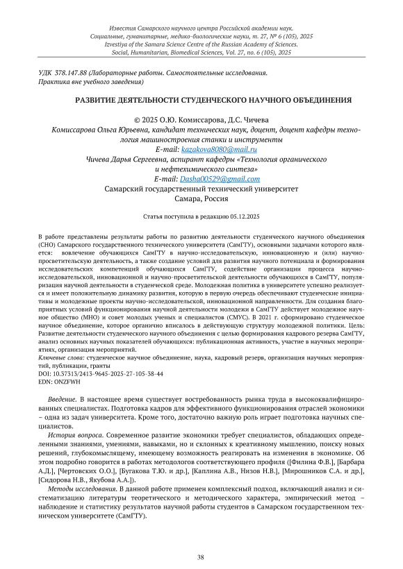 В работе представлены результаты работы по развитию деятельности студенческого научного объединения (СНО) Самарского государственного технического университета (СамГТУ), основными задачами которого является: вовлечение обучающихся СамГТУ в научноисследовательскую, инновационную и (или) научнопросветительскую деятельность, а также создание условий для развития научного потенциала и формирования исследовательских компетенций обучающихся СамГТУ, содействие организации процесса научноисследовательской, инновационной и научнопросветительской деятельности обучающихся в СамГТУ, популяризация научной деятельности в студенческой среде. Молодежная политика в университете успешно реализуется и имеет положительную динамику развития, которую в первую очередь обеспечивают студенческие инициативы и молодежные проекты научноисследовательской, инновационной направленности. Для создания благоприятных условий функционирования научной деятельности молодежи в СамГТУ действует молодежное научное общество (МНО) и совет молодых ученых и специалистов (СМУС). В 2021 г. сформировано студенческое научное объединение, которое органично вписалось в действующую структуру молодежной политики. Цель: Развитие деятельности студенческого научного объединения с целью формирования кадрового резерва СамГТУ, анализ основных научных показателей обучающихся: публикационная активность, участие в научных мероприятиях, организация мероприятий.