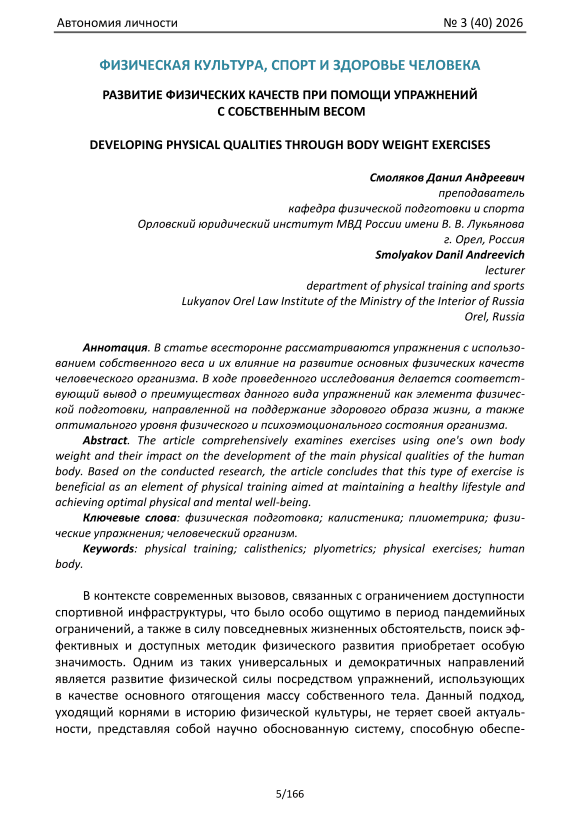 В статье всесторонне рассматриваются упражнения с использованием собственного веса и их влияние на развитие основных физических качеств человеческого организма. В ходе проведенного исследования делается соответствующий вывод о преимуществах данного вида упражнений как элемента физической подготовки, направленной на поддержание здорового образа жизни, а также оптимального уровня физического и психоэмоционального состояния организма.