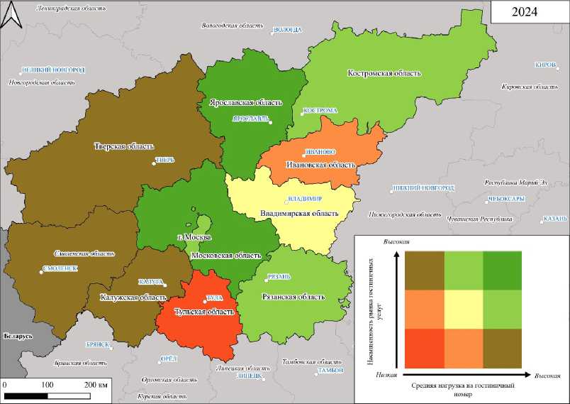Таким образом, для формирования интегральной оценки уровня развития гостиничной индустрии в субъектах Большого Золотого Кольца предлагается использовать систему из двух взаимодополняющих показателей: насыщенности рынка гостиничных услуг и средней нагрузки на гостиничный номер, что позволяет провести многомерный анализ и выявить диспропорции в развитии гостиничной инфраструктуры.