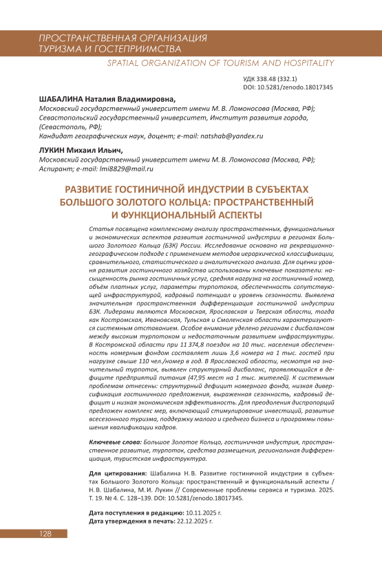 Статья посвящена комплексному анализу пространственных, функциональных и экономических аспектов развития гостиничной индустрии в регионах Большого Золотого Кольца (БЗК) России. Исследование основано на рекреационно-географическом подходе с применением методов иерархической классификации, сравнительного, статистического и аналитического анализа. Для оценки уровня развития гостиничного хозяйства использованы ключевые показатели: насыщенность рынка гостиничных услуг, средняя нагрузка на гостиничный номер, объём платных услуг, параметры турпотоков, обеспеченность сопутствующей инфраструктурой, кадровый потенциал и уровень сезонности. Выявлена значительная пространственная дифференциация гостиничной индустрии БЗК. Лидерами являются Московская, Ярославская и Тверская области, тогда как Костромская, Ивановская, Тульская и Смоленская области характеризуются системным отставанием. Особое внимание уделено регионам с дисбалансом между высоким турпотоком и недостаточным развитием инфраструктуры. В Костромской области при 11 374,8 поездок на 10 тыс. населения обеспеченность номерным фондом составляет лишь 3,6 номера на 1 тыс. гостей при нагрузке свыше 110 чел./номер в год. В Ярославской области, несмотря на значительный турпоток, выявлен структурный дисбаланс, проявляющийся в дефиците предприятий питания (47,95 мест на 1 тыс. жителей). К системным проблемам отнесены: структурный дефицит номерного фонда, низкая диверсификация гостиничного предложения, выраженная сезонность, кадровый дефицит и низкая экономическая эффективность. Для преодоления диспропорций предложен комплекс мер, включающий стимулирование инвестиций, развитие всесезонного туризма, поддержку малого и среднего бизнеса и программы повышения квалификации кадров.