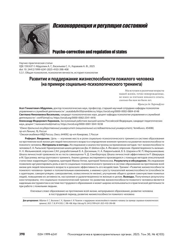 Введение. Цель — изучение места и роли социально-психологического тренинга в системе образования на протяжении всей жизни для людей пенсионного возраста и определение влияния тренинга на развитие жизнеспособности пожилого человека. Материалы и методы. Исследование и анализ построены на применении методик: тест жизнеспособности человека Е. А. Рыльской; Гериатрическая шкала депрессии Дж. И. Шейха и Дж. А. Йесаваге; опросник «Удовлетворенность жизнью» Н. Н. Мельниковой; опросник САН, разработанный В. А. Доскиным, Н. А. Лаврентьевой, В. Б. Шараем и М. П. Мирошниковым; Шкала личностной тревожности из теста самооценки Ч. Д. Спилбергера; Шкала личностной эффективности Р. Шварцера и М. Ерусалема; метод группового тренинга. Анализ данных эксперимента производился с помощью методов описательной статистики: корреляции Спирмена, критерий Манна-Уитни, критерий Уилкоксона. Результаты и обсуждение. Исследование позволило аргументировать роль и место социально-психологического тренинга в системе образования на протяжении всей жизни для людей пенсионного возраста и доказало эффективность его воздействия. Тренинг «Развитие жизнеспособности пожилого человека» привел к положительным изменениям, а именно к росту показателей жизнеспособности (способности к адаптации, саморегуляции, саморазвитию, осмысленности жизни), улучшению общего уровня самочувствия пожилых людей, повышению их активности, настроения и удовлетворенности жизнью в целом. Выводы. Полученные результаты констатировали, что социально-психологический тренинг по развитию жизнеспособности пожилого человека является надежным инструментом в системе посттрудового образования и может широко использоваться в практической деятельности при работе с пожилыми людьми.