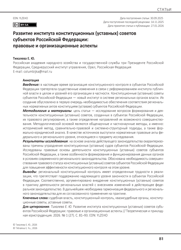Развитие института конституционных (уставных) советов субъектов Российской Федерации: правовые и организационные аспекты