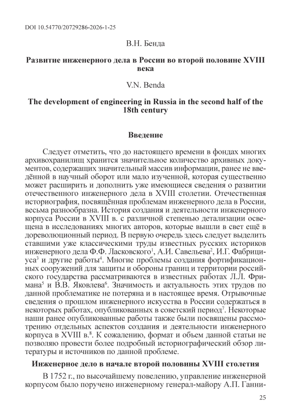 Следует отметить, что до настоящего времени в фондах многих архивохранилищ хранится значительное количество архивных документов, содержащих значительный массив информации, ранее не введённой в научный оборот или мало изученной, которая существенно может расширить и дополнить уже имеющиеся сведения о развитии отечественного инженерного дела в XVIII столетии. Отечественная историография, посвящённая проблемам инженерного дела в России, весьма разнообразна. История создания и деятельности инженерного корпуса России в XVIII в. с различной степенью детализации освещена в исследованиях многих авторов, которые вышли в свет ещё в дореволюционный период. В первую очередь здесь следует выделить ставшими уже классическими труды известных русских историков инженерного дела Ф.Ф. Ласковского1, А.И. Савельева2, И.Г. Фабрици-уса3 и другие работы4. Многие проблемы создания фортификационных сооружений для защиты и обороны границ и территории российского государства рассматриваются в известных работах Л.Л. Фри-мана5 и В.В. Яковлева6. Значимость и актуальность этих трудов по данной проблематике не потеряна и в настоящее время. Отрывочные сведения о прошлом инженерного искусства в России содержаться в некоторых работах, опубликованных в советский период7. Некоторые наши ранее опубликованные работы также были посвящены рассмотрению отдельных аспектов создания и деятельности инженерного корпуса в XVIII в.8. К сожалению, формат и объем данной статьи не позволяю провести более подробный историографический обзор литературы и источников по данной проблеме.