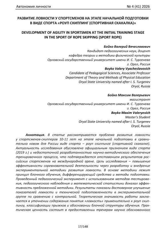 В статье рассматривается проблема развития ловкости у спортсменов-скипперов 10-11 лет на этапе начальной подготовки в сравнительно новом для России виде спорта – роуп скиппинге (спортивной скакалке). Актуальность исследования обусловлена официальным признанием вида спорта (2019 г.) и недостаточной разработанностью научно-методического обеспечения тренировочного процесса, что подтверждается отставанием результатов российских спортсменов на международной арене. Цель исследования – повышение эффективности соревновательной деятельности через разработку и внедрение экспериментальной методики развития ловкости. В основе методики лежит принцип блочного обучения, дифференцирующий средства и методы подготовки. Проведенный педагогический эксперимент с использованием методов тестирования, педагогического наблюдения и математической статистики доказал эффективность предложенной методики. Результаты показали достоверное улучшение показателей ловкости и технической подготовленности в экспериментальной группе по сравнению с контрольной. Теоретическая значимость работы заключается в уточнении содержания понятия «ловкость» применительно к роуп скиппингу, классификации прыжков и обосновании блочной структуры обучения. Практическая ценность состоит в предоставлении тренерам научно обоснованного инструмента для планирования учебно-тренировочного процесса, способствующего росту спортивного мастерства юных скипперов.
