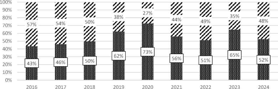 Важно отметить и превалирование частного финансирования в кооперационных проектах Сколтеха по сравнению с государственным софи-нансированием таких инициатив (рис. 1). Динамика была устойчиво положительной до 2020 г. включительно, когда доля частного финансирования достигла 73 %. Затем рост участия Сколтеха в сетевых проектах, поддерживаемых государством, несколько изменил соотношение, однако доля внебюджетного финансирования остается выше, чем в вузовской науке в среднем.