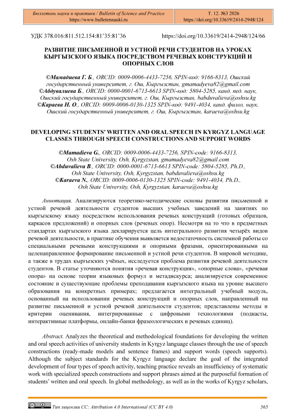 Анализируются теоретико-методические основы развития письменной и устной речевой деятельности студентов высших учебных заведений на занятиях по кыргызскому языку посредством использования речевых конструкций (готовых образцов, каркасов предложений) и опорных слов (речевых опор). Несмотря на то что в предметных стандартах кыргызского языка декларируется цель интегрального развития четырёх видов речевой деятельности, в практике обучения выявляется недостаточность системной работы со специальными речевыми конструкциями и опорными фразами, ориентированными на целенаправленное формирование письменной и устной речи студентов. В мировой методике, а также в трудах кыргызских учёных, исследуется проблема развития речевой деятельности студентов. В статье уточняются понятия «речевая конструкция», «опорные слова», «речевая опора» на основе теории языковых формул и метадискурса; анализируется современное состояние и существующие проблемы преподавания кыргызского языка на уровне высшего образования на конкретных примерах; предлагается интегральный учебный модуль, основанный на использовании речевых конструкций и опорных слов, направленный на развитие письменной и устной речевой деятельности студентов; представлены методы и критерии оценивания, интегрированные с цифровыми технологиями (подкасты, интерактивные платформы, онлайн-банки фразеологических и речевых единиц).