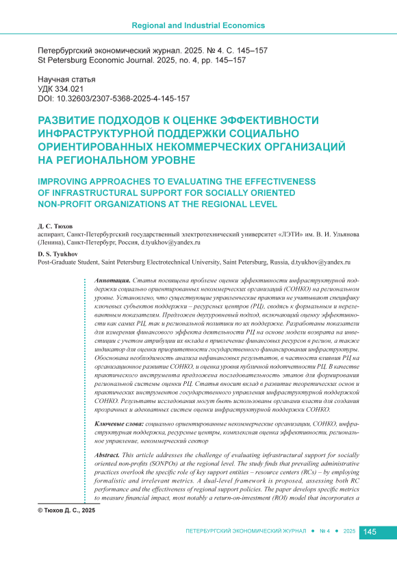 Статья посвящена проблеме оценки эффективности инфраструктурной поддержки социально ориентированных некоммерческих организаций (СОНКО) на региональном уровне. Установлено, что существующие управленческие практики не учитывают специфику ключевых субъектов поддержки – ресурсных центров (РЦ), сводясь к формальным и нерелевантным показателям. Предложен двухуровневый подход, включающий оценку эффективности как самих РЦ, так и региональной политики по их поддержке. Разработаны показатели для измерения финансового эффекта деятельности РЦ на основе модели возврата на инвестиции с учетом атрибуции их вклада в привлечение финансовых ресурсов в регион, а также индикатор для оценки приоритетности государственного финансирования инфраструктуры. Обоснована необходимость анализа нефинансовых результатов, в частности влияния РЦ на организационное развитие СОНКО, и оценка уровня публичной подотчетности РЦ. В качестве практического инструмента предложена последовательность этапов для формирования региональной системы оценки РЦ. Статья вносит вклад в развитие теоретических основ и практических инструментов государственного управления инфраструктурной поддержкой СОНКО. Результаты исследования могут быть использованы органами власти для создания прозрачных и адекватных систем оценки инфраструктурной поддержки СОНКО.
