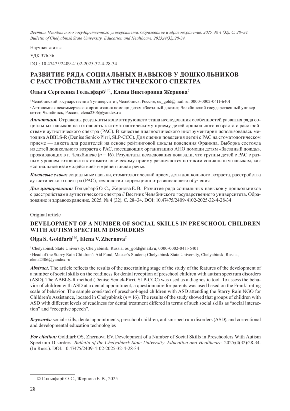 Отражены результаты констатирующего этапа исследования особенностей развития ряда социальных навыков на готовность к стоматологическому приему детей дошкольного возраста с расстрой- ствами аутистического спектра (РАС). В качестве диагностического инструментария использовалась методика ABBLS-R (Denise Senick-Pirri, SLP-CCC). Для оценки поведения детей с РАС на стоматологическом приеме — анкета для родителей на основе рейтинговой шкалы поведения Франкла. Выборка состояла из детей дошкольного возраста с РАС, посещающих организацию АНО помощи детям «Звездный дождь», проживающих в г. Челябинске (n = 16). Результаты исследования показали, что группы детей с РАС с разным уровнем готовности к стоматологическому приему различаются по таким социальным навыкам, как «социальное взаимодействие» и «рецептивная речь».