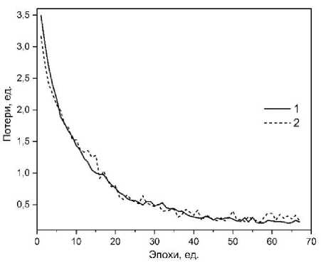 Рисунок 4. Расчетные значения параметров потерь обучения (1) и валидации (2)