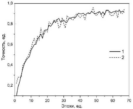 Рисунок 5. Расчетные значения параметров: точности обучения нейронной сети (1) и валидации (2)