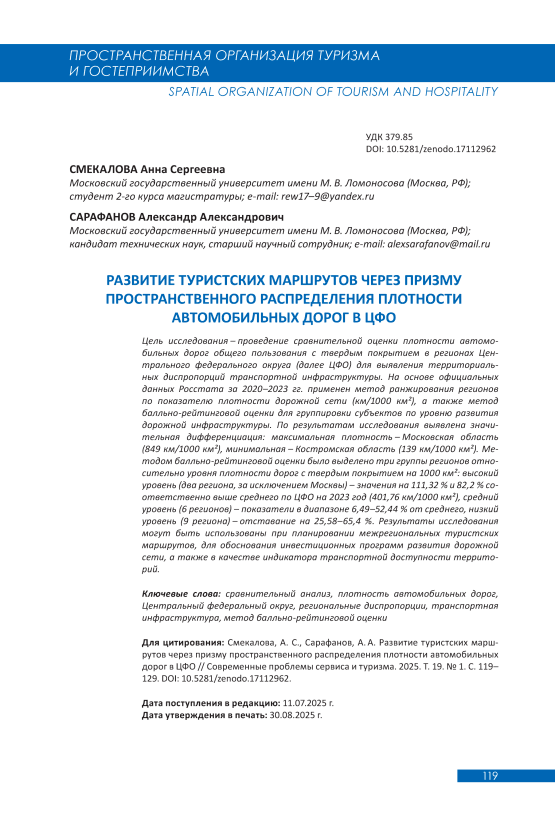Центральный федеральный округ, обладая высоким туристско-рекреационным потенциалом, демонстрирует выраженную разницу в уровне развития дорожнотранспортной инфраструктуры, что создает объективные предпосылки для проведения сравнительного анализа. Актуальность настоящего исследования обусловлена необходимостью выявления территориальных диспропорций транспортной обеспеченности, оказывающих непосредственное влияние на возможности проектирования и функционирования межрегиональных туристских маршрутов.
