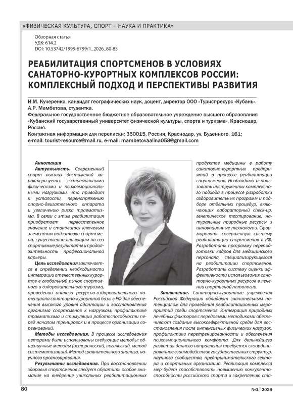 РЕАБИЛИТАЦИЯ СПОРТСМЕНОВ В УСЛОВИЯХ САНАТОРНО-КУРОРТНЫХ КОМПЛЕКСОВ РОССИИ: КОМПЛЕКСНЫЙ ПОДХОД И ПЕРСПЕКТИВЫ РАЗВИТИЯ