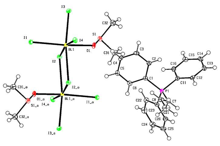 Четыре атома иода и атом висмута аниона комплекса 1 лежат практически в экваториальной плоскости BiI4 [длины связей Bi - I составляют 3,0180 - 3,1029(3) А], с каждой стороны которой располагаются по молекуле диметилсульфоксида, которые связаны с атомом металла прочными связями Bi - O 2,346(2) и 2,382(3) А.