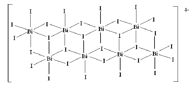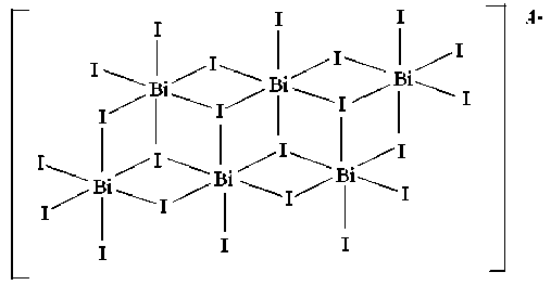 В восьмиядерном анионе [Bi 8 I 28 ]4–, как и в предыдущем анионе, две цепочки из атомов висмута и иодных мостиков соединяются друг с другом через атомы иода (рис. 4).