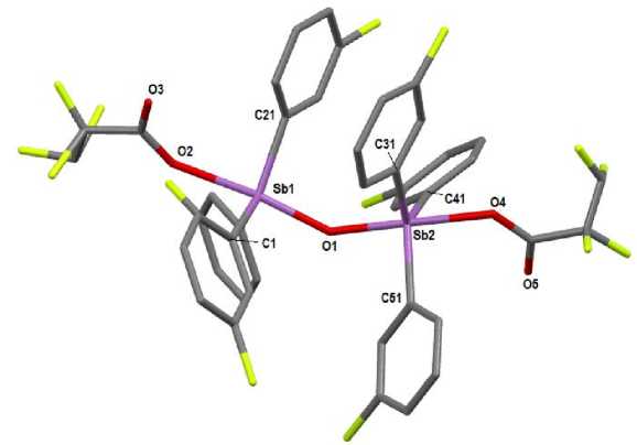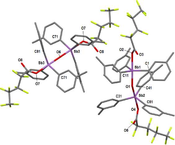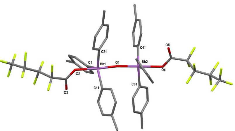 Текст научной статьи Реакции окислительного присоединения триарильных соединений сурьмы с фторированными карбоновыми кислотами. Строение продуктов реакции [3-CH3C6H4)3SbOC(O)(CF2)3CF3]2O, [3-CH3C6H4)3SbOC(O)CF2CF2H]2O, [4-CH3C6H4)3SbOC(O)(CF2)3CF3]2O и [(3-FC6H4)3SbOC(O)CF2CF2H]2O