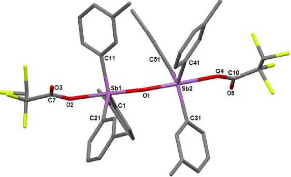 Соединения 1 и 3 являются изомерами и отличаются только положением метильных групп в арильных кольцах. В молекулах 1 а и 3 с одинаковым строением центральных фрагментов [углы SbOSb 142,8(2) ° и 143,9(2) ° соответственно], аксиальные и экваториальные углы, углы между экваториальными и аксиальными связями, характеризующие координационные полиэдры атомов сурьмы, имеют близкие значения. Связи Sb - С [средние значения 2,093(7) А и 2,101(5) А в 1 а и 3 ] в мета -толильном и пара -толильном производных практически равны. В пара -толильном производном 3 среднее значение связей Sb - Отерм (2,257(3) А) больше, а связей Sb - Омост [1,955(3) А] меньше, чем в мета -толильном производном 1 а [2,238(4) Å и (1,964(4) Å соответственно].