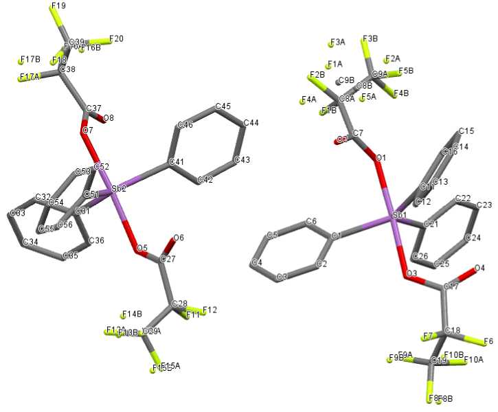 Окисление трифенилсурьмы, гидропероксидом кумила в присутствии пентафторпропионовой кислоты или пентафторфенола приводит после перекристаллизации целевых продуктов из смеси бензол - октан к образованию бис (пентафторпропионата) трифенилсурьмы Ph 3 Sb[OC(O)CF 2 CF 3 ] 2 ( 1 ) и бис (пентафторфенолята) трифенилсурьмы Ph3Sb[OC6F5]2 ( 2 ) соответственно, строение которых установлено методом рентгеноструктурного анализа. Атомы сурьмы в молекулах 1 , 2 имеют искаженную тригонально-бипирамидальной конфигурацию с атомами кислорода в аксиальных положениях. Внутримолекулярные контакты Sb∙∙∙O в 1 между центральным атомом металла и карбонильными атомами кислорода составляют 3,198(5), 3,244(6) Å для 1А и 3,170(5), 3,207(6) Å для 1В , что меньше суммы ван-дер-ваальсовых радиусов атомов-партнеров (3,7 Å), поэтому можно считать, что координационное число атома металла увеличено до КЧ = 7. Геометрические параметры комплексов отличаются из-за различной природы электроотрицательных заместителей при атоме металла.