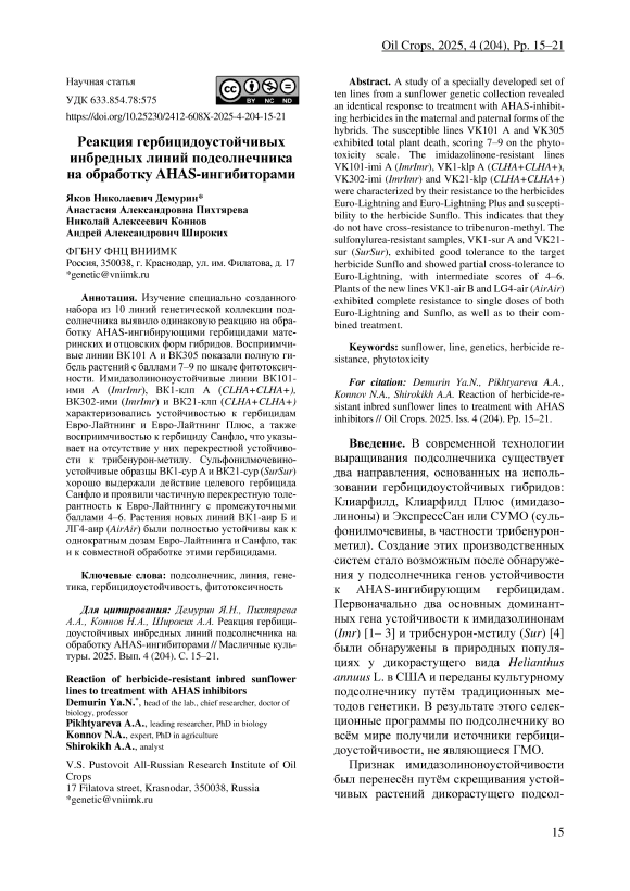 IDR: 142247027 | УДК: 633.854.78:575 | DOI: 10.25230/2412-608X-2025-4-204-15-21