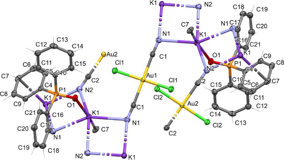 Из да н н ых Р СА сле дует, что к рис та лл ы 1 состоят из катионов [K]+, молекул оксида трифенилфосфина (P=O 1 , 4928(18) Å) , координированным атомом кислорода на атом калия (расстояние O∙∙∙K 2,610(2) Å) и д и хлородицианоауратных групп, связанных в единое ц е лое ( ри с . 2 ) . Ци а н огру п п ы че рез а томы азота к оорди ни ров а ны с μ 4 -мостиковыми ионами калия (N∙∙∙K 2,861(2)– 2,945(2) Å), поэтому аддукт 1 п редс та в ляе т соб ой 2D координационный полимер.
