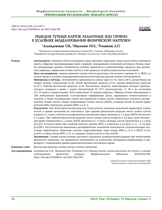 Актуальность. Тканевые клетки миелоидного ряда занимают уникальное звено среди клеток иммунного ответа и образуют кооперационные связи с нервной, эндокринной и иммунной системами. Печень, являясь центральным органом метаболизма, активно вовлекается в адаптационные процессы при физических нагрузках, однако роль тучных клеток в этих процессах остаётся недостаточно изученной. Цель исследования: оценить реакцию тучных клеток различных зон печени и уровень IL-6, ФНО-α в плазме крови в условиях моделирования физической нагрузки разной степени интенсивности. Материалы и методы. Эксперименты проведены на самцах крыс (n=32, масса 240 г), разделённых на четыре группы: контрольная (n=8), лёгкая физическая нагрузка (n=8), средняя физическая нагрузка (n=8) и тяжёлая физическая нагрузка (n=8). Физическую нагрузку моделировали методом принудительного плавания в ванне с водой температурой 29–32°С длительностью 15, 30 и до утомления (55–59 минут) соответственно. Всего выполнено 10 сеансов нагрузки. Образцы печени фиксировали в 10% нейтральном формалине, изготавливали парафиновые срезы, окрашивали гематоксилином и эозином, а также толуидиновым синим для выявления тучных клеток. Определяли плотность распределения тучных клеток, индекс дегрануляции тучных клеток (ИДТК), площадь клеток. В плазме крови методом ИФА определяли уровень ФНО-α и IL-6. Результаты. При лёгкой физической нагрузке статистически значимых изменений параметров тучных клеток и уровня цитокинов не отмечалось. При средней физической нагрузке число тучных клеток возросло в 1,6 раза, плотность распределения компактных форм снизилась в 1,1 раза, ИДТК увеличился в 1,4 раза. При тяжёлой физической нагрузке число тучных клеток возросло в 2,8 раза, доля компактных форм уменьшилась в 1,2 раза, ИДТК увеличился в 1,9 раза, площадь клеток увеличилась в 1,6 раза (p<0,05). В плазме крови при тяжёлой нагрузке уровень ФНО-α повысился в 4,4 раза, IL-6 – в 2,6 раза (р<0,001). Гистологически выявлялись дистрофические изменения гепатоцитов и воспалительные клеточные инфильтраты. Выявлены сильные корреляционные связи между ФНО-α, IL-6 и ИДТК (r=0,9, р<0,05), а также между ФНО-α, IL-6 и уровнем тучных клеток (r=0,8, р<0,05). Заключение. Тучные клетки печени участвуют в развитии воспалительной реакции при интенсивных физических нагрузках, что проявляется увеличением их количества, активацией дегрануляции и коррелирует с повышением уровня провоспалительных цитокинов в крови.