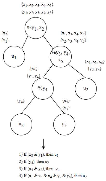 Функциональное множество может быть определено как множество операций, отделяющих термы из различных лингвистических переменных, тем самым присваивая им в соответствие какой-то терм целевой лингвистической переменной. Пример представления особи для базы правил, реализованной с помощью генетического программирования (рассматривается случай с двумя лингвистическими переменными и одной целевой переменной), показан на рис. 3.