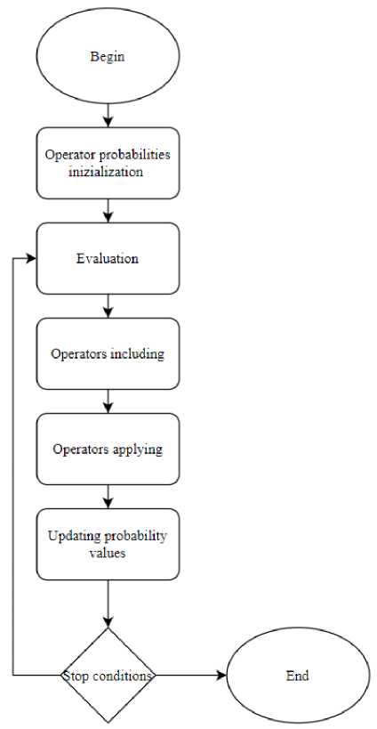 По мере выполнения алгоритма вероятность выбора эффективного оператора увеличивается, в то время как вероятности выбора других уменьшаются. Снижающиеся вероятности ограничиваются заданным нижним пределом, что гарантирует продолжение использования всех операторов в той или иной степени.