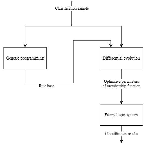 В статье рассматривается подход, использующий самоконфигурируемое генетическое программирование для эволюции базы нечетких правил в сочетании с алгоритмом дифференциальной эволюции, в частности L-SRTDE [8], для оптимизации параметров функций принадлежности. Реализация данной системы требует выполнения следующих шагов:
