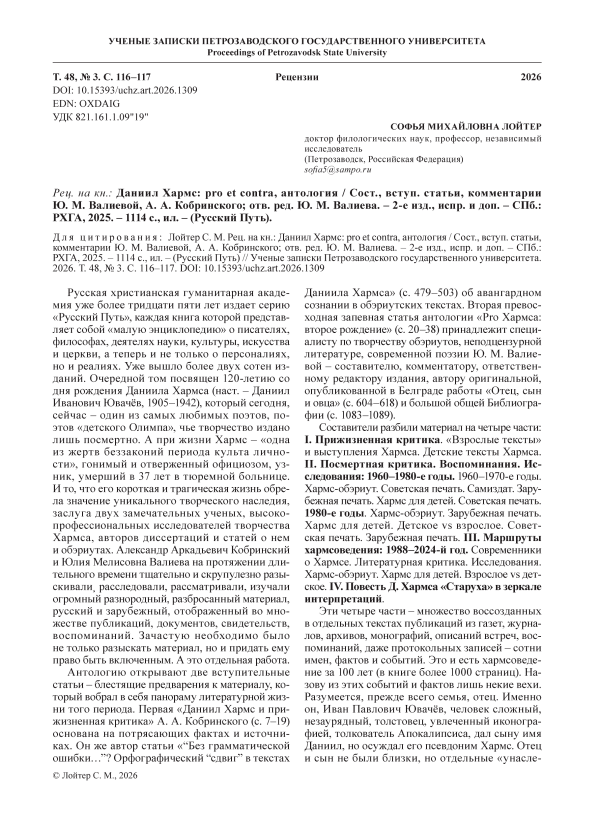 Рец. на кн.: Даниил Хармс: pro et contra, антология / Сост., вступ. статьи, комментарии Ю. М. Валиевой, А. А. Кобринского; отв. ред. Ю. М. Валиева. – 2-е изд., испр. и доп. – СПб.: РХГА, 2025. – 1114 с., ил. – (Русский Путь)