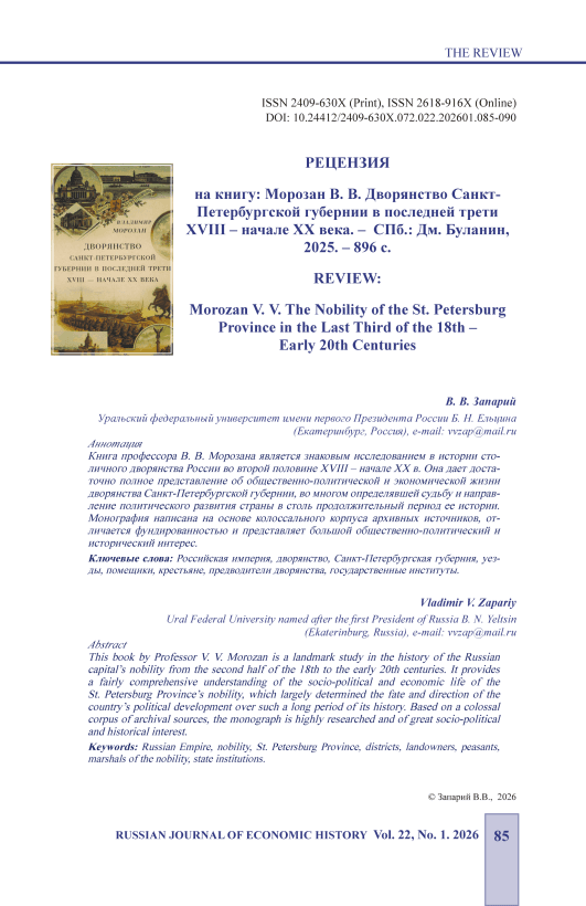 Рецензия на книгу: Морозан В. В. Дворянство Санкт- Петербургской губернии в последней трети XVIII ‒ начале ХХ века. – СПб.: Дм. Буланин, 2025. – 896 с.