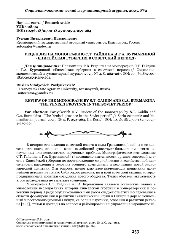 Рецензия на монографию С.Т. Гайдина и Г.А. Бурмакиной «Енисейская губерния в советский период»