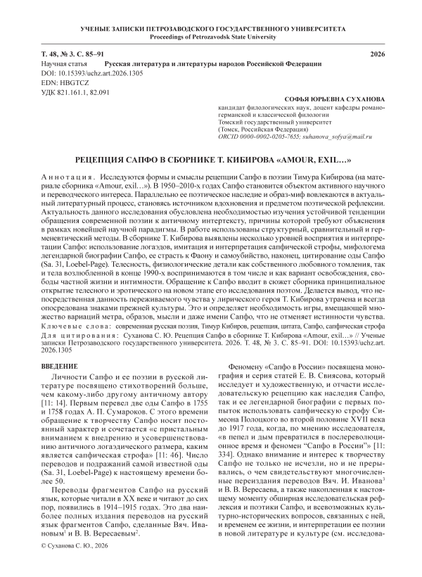 The aim of the article is to analyze the reception of Sappho in the collection of poems Amour, Exil… by Timur Kibirov. From 1950 to 2010, Sappho’s poetry underwent extensive research, translation, and critical reflection; to these were added reflections on her work and the mythologems associated with her, which were incorporated into the realm of poetic contemplation. The relevance of this study is determined by the need to examine the persistent trend of modern poetry’s engagement with classical intertext, the reasons for which require explanation within the framework of the latest scientific paradigm. The research employs structural, comparative, and hermeneutic methods. Several levels of perception and interpretation of Sappho were identified in Kibirov’s collection of poems during the course of the study: the use of logaoedics, imitation and interpretation of the Sapphic stanza, the mythologem of Sappho’s legendary biography, her passion for Phaon, her suicide, and, finally, the citation of Sappho’s ode (Sa. 31, Loebel-Page). In the late 1990s, corporeality and physiological details of both one’s own amorous languor and the body of the beloved were perceived as a form of liberation, freedom of private life, and intimacy. The appeal to Sappho introduces the discovery of the bodily and erotic at a new stage of its exploration by the poet into the collection’s plot. It is concluded that the immediate reality of the experienced feeling is lost by Kibirov’s lyrical hero and is always mediated by the signs of the previous culture. This determines the necessity of a game encompassing a multitude of variations of meter, thought, and even the name of Sappho, none of which negates the authenticity of the feeling.