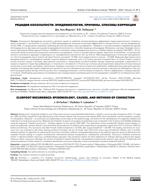 Актуальность. Врождённая косолапость является одной из наиболее распространённых деформаций опорно-двигательного аппарата у детей, встречаясь с частотой 0,6–1,5 случая на 1000 живорождённых. Несмотря на высокую эффективность метода Понсети, частота рецидивов достигает 40%, что представляет серьёзную проблему детской ортопедии. Цель исследования — обобщить и систематизировать современные данные об эпидемиологии, факторах риска развития врождённой косолапости и способах коррекции её рецидива. Материалы и методы. Проведён поиск и анализ публикаций в базах данных E-library и PubMed по ключевым словам «рецидив косолапости», «clubfoot relapse» за период 1964–2025 гг. В описательный обзор включены 83 актуальных клинических исследования, отчёта и систематических обзора. Результаты. Установлено, что распространённость косолапости варьирует в зависимости от географического региона (от 0,51 до 2,03 на 1000 живорождённых) и этнической принадлежности. Частота рецидивов после лечения методом Понсети составляет 10–30%, после хирургического лечения — 20–50%. Ведущими факторами риска рецидива являются: несоблюдение режима ношения брейсов (повышает риск в 5,4 раза), высокий исходный балл по шкале Пирани, возраст начала лечения старше 3 месяцев, двусторонняя косолапость. Представлен алгоритм выбора метода коррекции рецидива в зависимости от возраста пациента и характера деформации: от повторного гипсования по Понсети до сложных реконструктивных вмешательств (транспозиция сухожилий, остеотомии, артродезы). Заключение. Рецидивы косолапости остаются актуальной проблемой, требующей мультидисциплинарного подхода. Ключевыми факторами профилактики являются строгое соблюдение протокола ношения ортезов и регулярное наблюдение. При развитии рецидива выбор метода лечения должен быть индивидуализирован с учётом возраста пациента, тяжести деформации и предшествующего лечения. Необходимы дальнейшие исследования для стандартизации критериев диагностики рецидивов и разработки инновационных методов лечения.