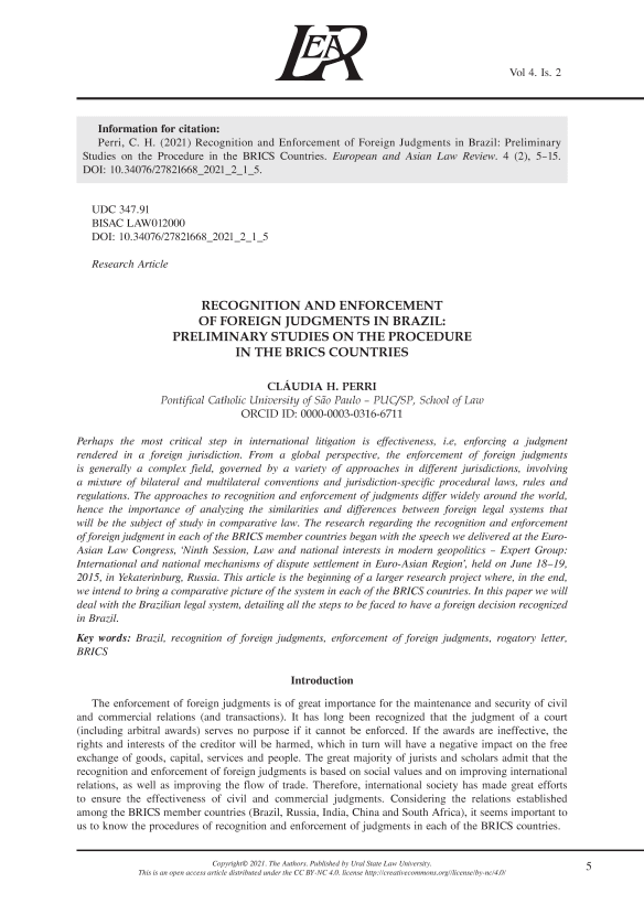 Perhaps the most critical step in international litigation is effectiveness, i.e, enforcing a judgment rendered in a foreign jurisdiction. From a global perspective, the enforcement of foreign judgments is generally a complex field, governed by a variety of approaches in different jurisdictions, involving a mixture of bilateral and multilateral conventions and jurisdiction-specific procedural laws, rules and regulations. The approaches to recognition and enforcement of judgments differ widely around the world, hence the importance of analyzing the similarities and differences between foreign legal systems that will be the subject of study in comparative law. The research regarding the recognition and enforcement of foreign judgment in each of the BRICS member countries began with the speech we delivered at the Euro-Asian Law Congress, ‘Ninth Session, Law and national interests in modern geopolitics – Expert Group: International and national mechanisms of dispute settlement in Euro-Asian Region’, held on June 18–19, 2015, in Yekaterinburg, Russia. This article is the beginning of a larger research project where, in the end, we intend to bring a comparative picture of the system in each of the BRICS countries. In this paper we will deal with the Brazilian legal system, detailing all the steps to be faced to have a foreign decision recognized in Brazil.