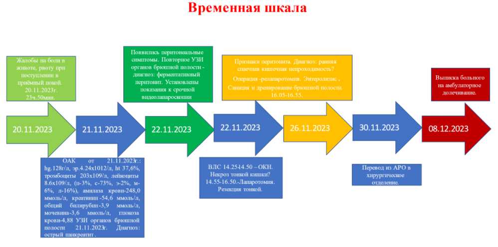 На основании полученных данных поставлен предварительный диагноз: К85.9 – острый панкреатит. Хронология развития болезни пациента М. и этапы лечения представлены на рис. 1.