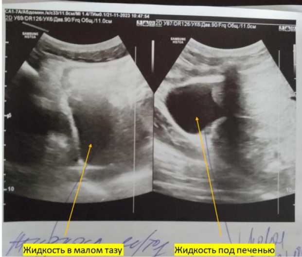 УЗИ органов брюшной полости 21.11.2023 г. 10 ч 47 м на аппарате Samsung HS70A конвекс-ным датчиком частотой 1–7 мгц: у правой доли печени жидкость 3,4 см; поджелудочная железа: головка – 26,7 мм, тело – 15,7 мм, хвост – 26,7 мм, однородность–неоднородная за счет мелкоочаговых диффузных изменений; в малом тазу жидкость до 7 см (рис. 2).