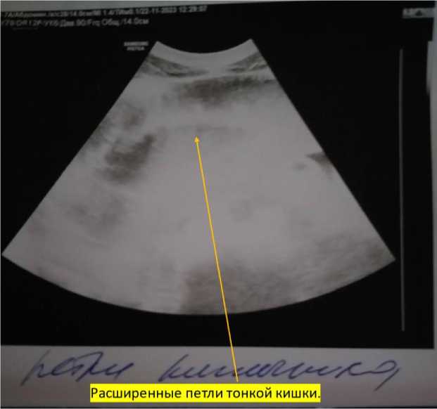 УЗИ органов брюшной полости 22.11.2023 г. Заключение: диффузные изменения паренхимы поджелудочной железы. Свободная жидкость в брюшной полости, малом тазу. В гипогастрии расширенные петли кишечника, перистальтика отсутствует (рис. 3). Возможна острая кишечная непроходимость.