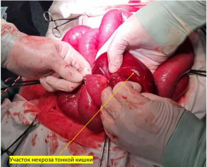 Рис. 4. Участок некроза подвздошной кишки (интраоперационная фотография)