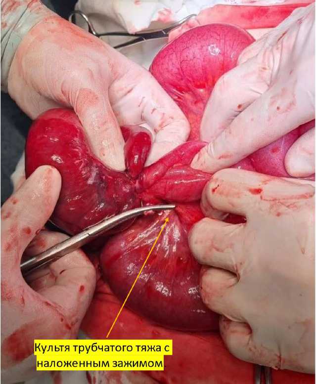 Рис. 5. Зажим наложен на культю от одной из пересеченных трубчатых структур (интраоперационная фотография)