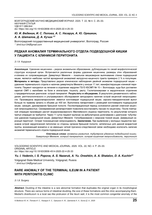 Удвоение кишечника – редкое аномальное образование, дублирующее по своей морфологической структуре исходный орган. Встречаются различные формы удвоения кишечника, размеры этих образований и клиника их сопровождающая. Дивертикул Меккеля – локальное мешковидное выпячивание стенки подвздошной кишки, является наиболее частой врожденной аномалией желудочно-кишечного тракта примерно 2 % в популяции. Материалы и методы. Представлено редкое клиническое наблюдения двойной аномалии подвздошной кишки – удвоение терминального отдела и наличие дивертикула Меккеля у юноши 17 лет, манифестирующее клиникой перитонита. Пациент находился на лечении в отделении хирургии ГБУЗ КБСМП № 15 г. Волгограда, куда был доставлен каретой СМП с жалобами на боли в эпигастрии, тошноту, рвоту. Госпитализирован в хирургическое отделение с предварительным диагнозом: острый панкреатит. Результаты и обсуждение. В результате динамического наблюдения, рентгенологического и ультразвукового обследования заподозрено наличие острой кишечной непроходимости. Произведена видеолапароскопия: имеется конгломерат подвздошной кишки, серозно-геморрагический выпот больше по правому флангу в объеме до 400 мл. Выполнена лапаротомия с резекцией конгломерата подвздошной кишки, санация, дренирование брюшной полости. Послеоперационный период осложнился ранней спаечной кишечной непроходимостью. Своевременная релапаротомия позволила восстановить пассаж по кишечнику. После повторной операции произведен расчет модернизированного Мангеймского индекса перитонита, по результатам которого третья операция не требуется. Через 11 суток пациент выписан на амбулаторное долечивание с диагнозом: тубулярное удвоение подвздошной кишки. Дивертикул Меккеля. Узлообразование с некрозом тонкой кишки. Диффузный серозный перитонит. Острая тонкокишечная непроходимость. Заключение. При выявлении у молодых пациентов признаков острой хирургической патологии со стороны органов брюшной полости, нетипичных для данной возрастной группы, возникающей внезапно и не имеющих четкой причинно-следственной связи необходимо исключить наличие аномалий терминального отдела подвздошной кишки.