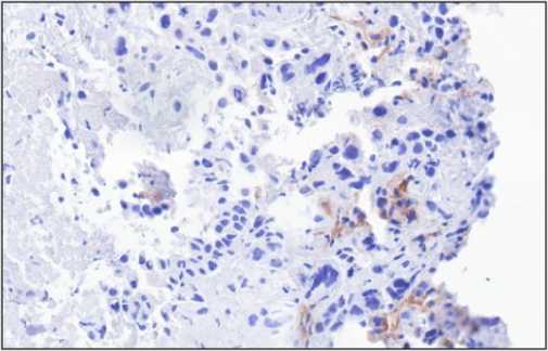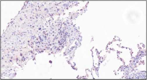 Рис. 1. Злокачественная опухоль в операционном материале легкого: a – атипичные клетки среди масс крови (окраска гематоксилином и эозином, ×40); b – негативная реакция с AFP (×20); с – экспрессия единичными клетками Glypican3 (×40)