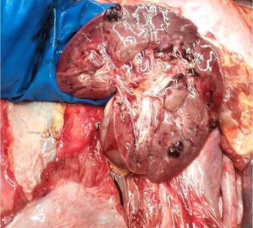 Рис. 2. Метастазы в правой почке: a - макроскопически на разрезе темно-красные солидные очаги опухоли; b – микроскопически выявлены атипичные синцитио и цитотрофобласты (гематоксилин и эозин, ×40)